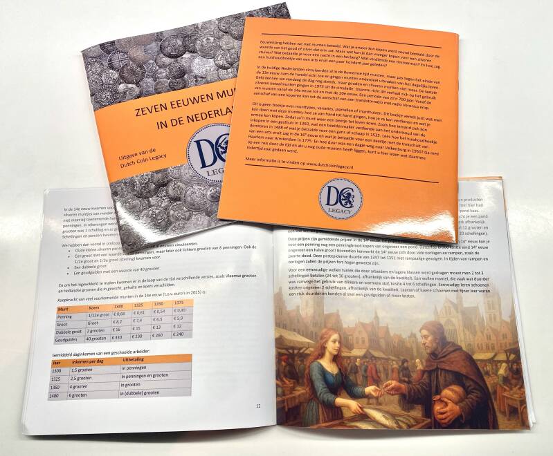 Een prachtig boekje "Zeven Eeuwen Muntgeld In De Nederlanden" is op 3 november gepubliceerd en wordt in november en december gratis meegeleverd bij aankoop van tenminste 100 euro in de webshop. Dan wordt uw aankoop gratis verzonden met track en trace én krijgt u dit prachtige boekje op de koop toe met ruim 50 pagina's informatie over het gebruik van munten, wat je ervoor kon kopen en hoe je ze kon verdienen. Eeuwenlang hebben we gouden, zilveren en koperen munten gebruikt in ons dagelijks bestaan. Zoals grooten, duiten, stuivers, guldens en daalders. De wereld van de numismatiek is een reis door de geschiedenis. Munten die eeuwenlang van hand tot hand gingen. Verdiend door een timmerman in 1354, uitgegeven voor een maaltijd of overnachting in 1480, of waarmee de weekhuur is betaald in 1520. Dit boekje gaat hier verder op in.
