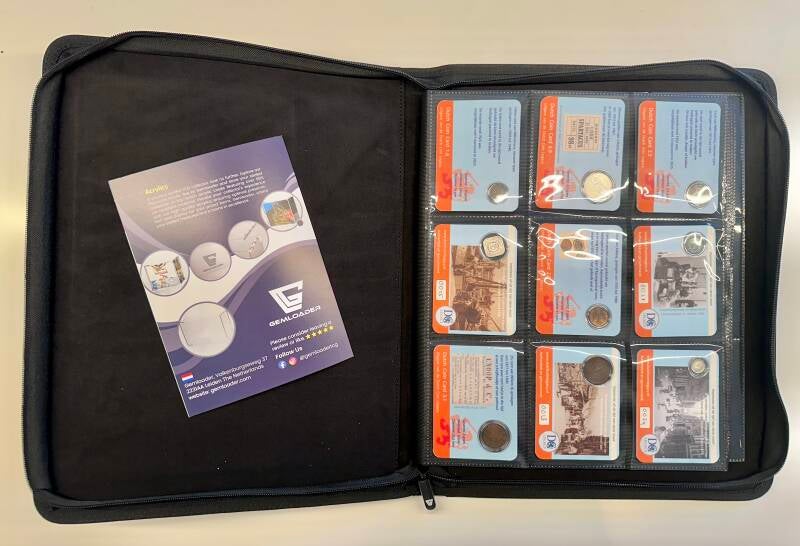 De Dutch Coin Cards hebben een afmeting van 10 cm bij 7,5 cm ofwel vrijwel 4'' bij 3''. Dat is een standaard toploader maat voor verzamelkaarten zoals Pokémon en Sportkaarten. Daarmee passen de coincards in elke verzamelmap of -box geschikt voor 2mm dikke toploaders. Bijvoorbeeld de pocket toploader binders van Gemloader. Verkrijgbaar in verschillende maten en kleuren.