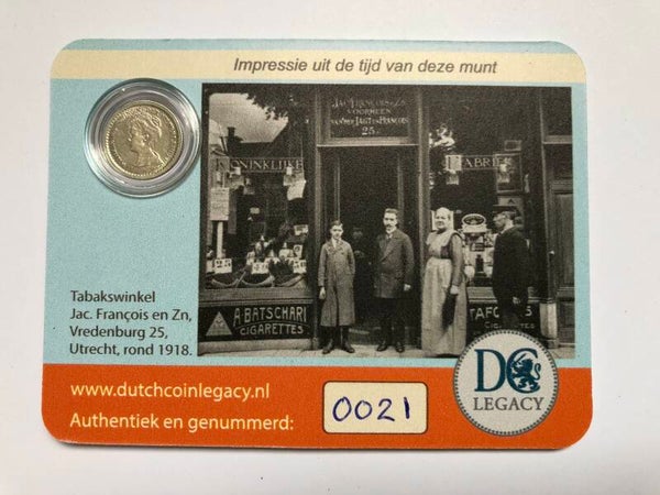 Het dubbeltje of 10 cent type "Hermelijnen mantel" van Wilhelmina, geslagen tussen 1910 en 1925. DCC 5.6 is één van de 86 Dutch Coin Cards die de geschiedenis van het muntgeld uit het koninkrijk der Nederlanden vertellen. De munt is in die tijd van hand tot hand gegaan, maar speciaal geselecteerd op een mooie kwaliteit. Minimaal Zeer Fraai. Zie ook de foto's. Elke coincard is authentiek en uniek genummerd.