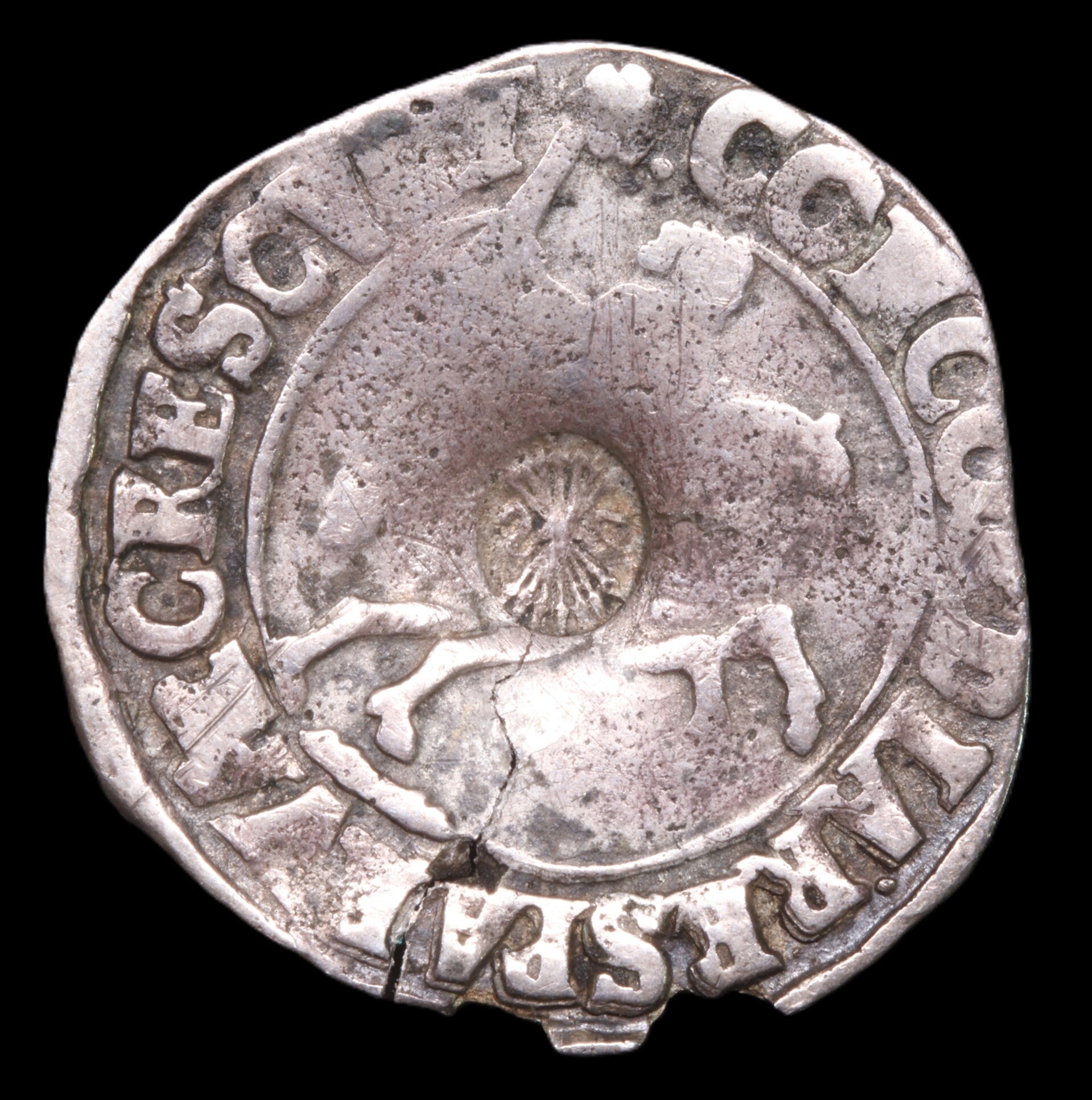 Leuke rijderschelling uit 1690 met klop pijlenbundel. Iets uitgebroken rand.