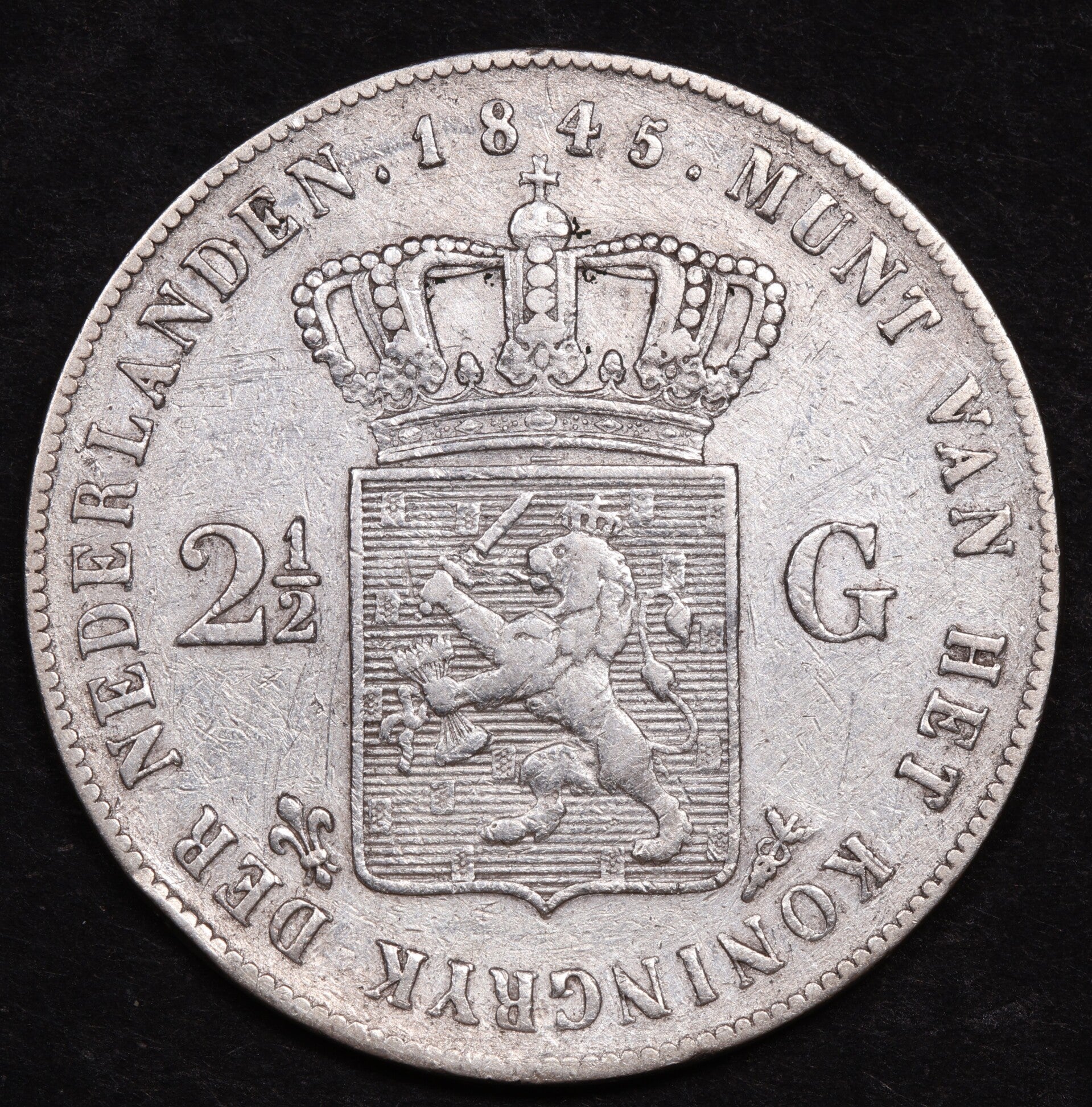 Rijksldaader 1845 met streepje tussen wapen en kroon.