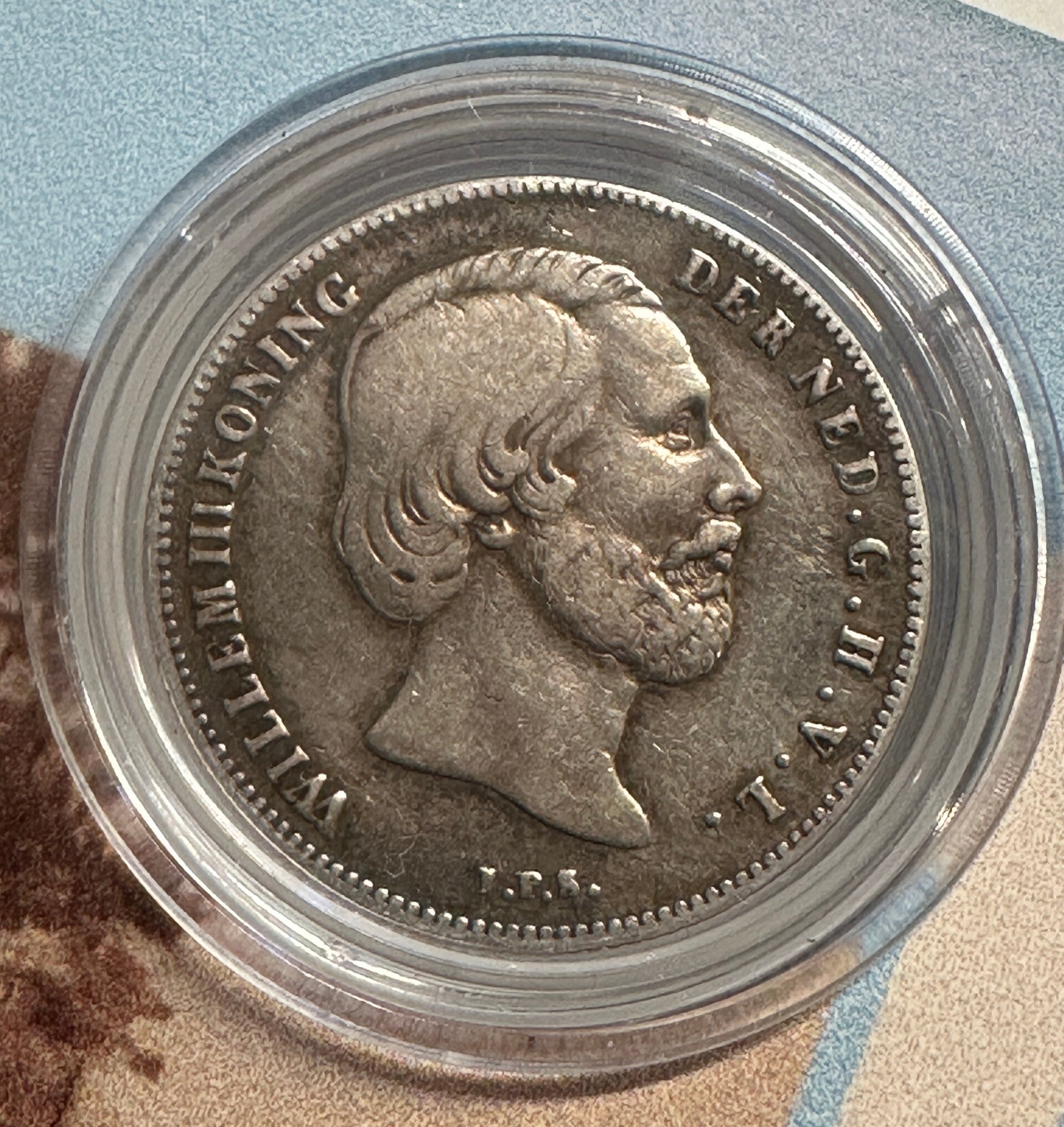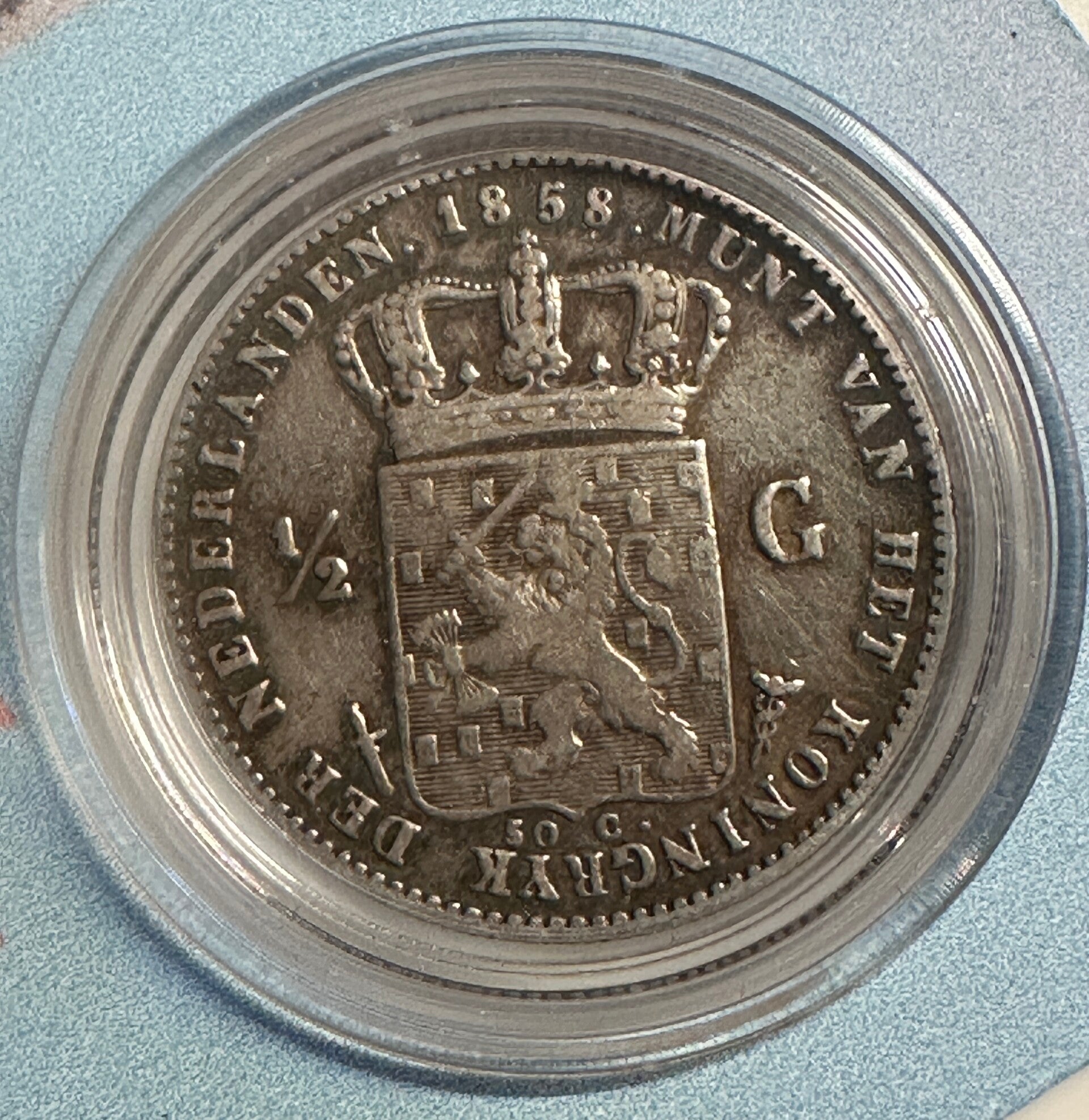 Halve gulden van Willem III geslagen tussen 1850 en 1858. DCC 7.3 is één van de 86 Dutch Coin Cards die de geschiedenis van het muntgeld uit het koninkrijk der Nederlanden vertellen. De munt is in die tijd van hand tot hand gegaan, maar speciaal geselecteerd op een mooie kwaliteit. Minimaal Zeer Fraai. Zie ook de foto's. Elke coincard is authentiek en uniek genummerd.